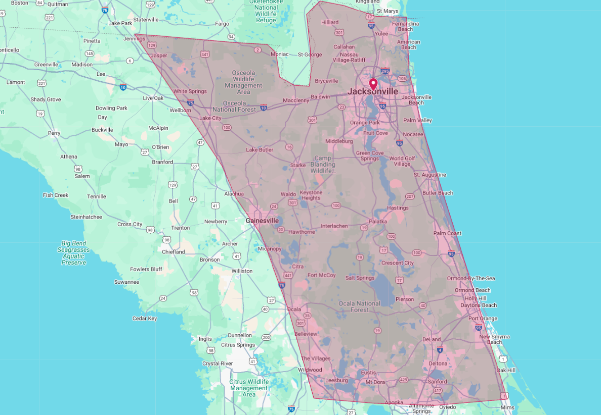 Jacksonville & North Eastern Florida, South to Orlando, East to Ocala, Gainesville, Lake City, and all the way to the Georgia border.
